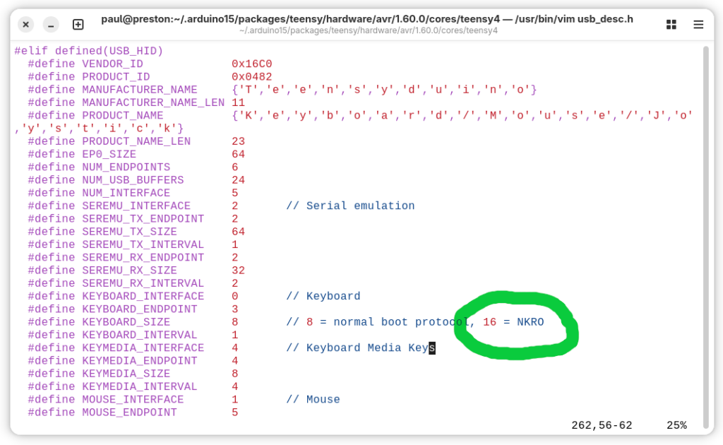 Traditional 6 key mode is still the default, for maximum compatibility with PC bios and KVM switches. To enable NKRO mode, you must edit usb_desc.h within the core library. Simply change KEYBOARD_SIZE to 16 for all-keys NKRO.