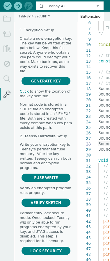 One unfortunate side effect is an empty “Teensy 4 Security” menu appears. This is a bug Arduino IDE 2 inherits from Theia IDE. It has been assigned Arduino IDE issue #2848. Hopefully future Arduino IDE will fix this issue.