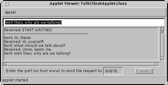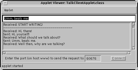 Note: For some reason, this example works with Applet Viewer but not with Netscape Navigator. In Netscape, the rendezvous is successful, but the applets always say "NOTE: Couldn't read from socket." (which means an IOException occurred). The output stream seems to work, though, because the applet data gets to the server. (The server seems to see nothing wrong.) Perhaps Netscape has a bug on reading DataInputStream?