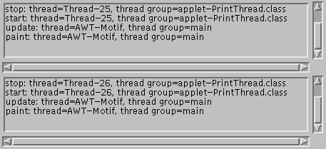 init(),start(),stop(),destroy(),paint(), andupdate()are called from. (Here's the code.) PrintThread callsrepaint()unnecessarily every once in a while, so that you'll be able to see how itsupdate()andpaint()get called. As usual, to see the output for the methods such asdestroy()that are called during unloading, you need to look at the standard output. [LINK]