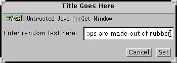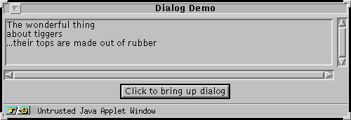 Here's the code for the window that the above applet brings up. This code can be run as a standalone application or, with the help of the AppletButton class, as an applet (as above). Here's just the code that deals with the Dialog object: