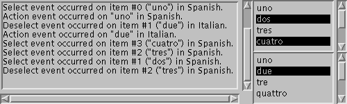 Below is an applet that shows two lists. The first list (which lists Spanish numbers) allows multiple selections. The second (which lists Italian numbers) allows a maximum of one selection. Note that the first item in each list has index 0.