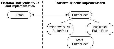 Below is a figure that illustrates how a typical AWT component (a Button) is mapped to a peer. Button peers are implemented in platform-specific classes that implement the java.awt.peer ButtonPeer interface. The java.awt Toolkit class defines methods that choose exactly which class to use for the peer implementation.