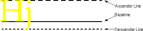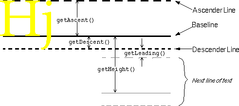 getAscent()method returns the number of pixels between the ascender line and the baseline. Generally, the ascender line represents the typical height of capital letters. Specifically, the ascent and descent values are chosen by the font's designer to represent the correct text "color", or density of ink, so that the text appears as the designer planned it. The ascent typically provides enough room for almost all of the characters in the font, except perhaps for accents on capital letters. ThegetMaxAscent()method accounts for these exceptionally tall characters.getDescent(),getMaxDescent()- The