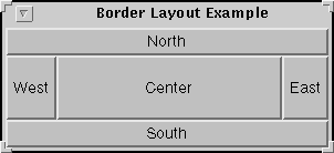 BorderLayout is the default layout manager for all Windows, such as Frames and Dialogs. It uses five areas to hold components: north, south, east, west, and center. All extra space is placed in the center area. Here's an applet that puts one button in each area.