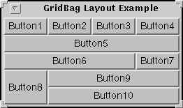 GridBagLayout is the most sophisticated, flexible layout manager we provide. It aligns components by placing them within a grid of cells, allowing some components to span more than one cell. The rows in the grid aren't necessarily all the same height; similarly, grid columns can have different widths. Here's an applet that uses a GridBagLayout to manage ten buttons in a panel.