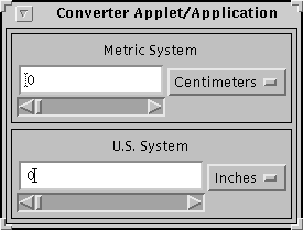 Each ConversionPanel has four children: a Label, a TextField, a Scrollbar, and a Choice. Here's the code that adds the children:public class Converter extends Applet { . . . public void init() { . . . //Create metricPanel and usaPanel, . . . //two ConversionPanels. add(metricPanel); add(usaPanel); }The GridBagConstraints is an object that tells the GridBagLayout (the layout manager for this Panel) how to place a particular component. GridBagLayout, along with our other layout managers, is discussed in Laying Out Components within a Container.class ConversionPanel extends Panel { . . . ConversionPanel(Converter myController, String myTitle, Unit myUnits[]) { . . . //Add the label Label label = new Label(title, Label.CENTER); //...Set up GridBagConstraints for this Component... gridbag.setConstraints(label, c); add(label); //Add the text field textField = new TextField("0", 10); //...Set up GridBagConstraints for this Component... gridbag.setConstraints(textField, c); add(textField); //Add the pop-up list (Choice) unitChooser = new Choice(); //...Initialize the Choice... //...Set up GridBagConstraints for this Component... gridbag.setConstraints(unitChooser, c); add(unitChooser); //Add the slider slider = new Scrollbar(Scrollbar.HORIZONTAL, 0, 100, min, max); //...Set up GridBagConstraints for this Component... gridbag.setConstraints(slider, c); add(slider); }Summary
