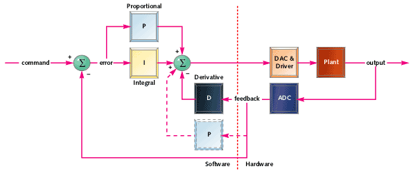 In a typical PID controller these elements are driven by a combination of the system command and the feedback signal from the object that is being controlled (usually referred to as the "plant"). Their outputs are added together to form the system output.