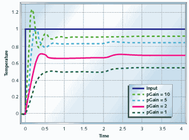 Figure 10 shows what happens when you use pure proportional feedback with the temperature controller. I'm showing the system response with a disturbance due to a change in ambient temperature at t = 2s. Even without the disturbance you can see that proportional control doesn't get the temperature to the desired setting. Increasing the gain helps, but even with kp = 10 the output is still below target, and you are starting to see a strong overshoot that continues to travel back and forth (this is called ringing).