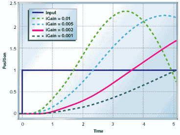 Once you have your proportional gain set, start increasing integral gain. Your starting values will probably be from 0.0001 to 0.01. Here again, you want to find the range of integral gain that gives you reasonably fast performance without too much overshoot and without being too close to oscillation.