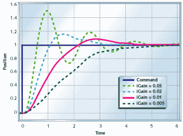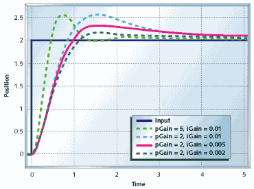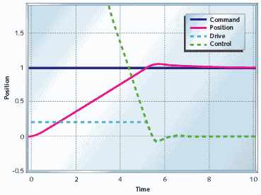Figure 13 shows the motor and gear with proportional and integral (PI) control. Compare this with Figures 8 and 11. The position takes longer to settle out than the system with pure proportional control, but it will not settle to the wrong spot.