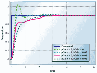 Figure 12 shows the temperature control system with pure integral control. This system takes a lot longer to settle out than the same plant with proportional control (see Figure 10), but notice that when it does settle out, it settles out to the target value-even with the disturbance added in. If your problem at hand doesn't require fast settling, this might be a workable system.