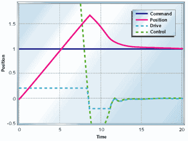 Figure 15 illustrates the effect of integrator windup. I used the motor/controller of Figure 13, and limited the motor drive to 0.2. Not only is controller output much greater than the drive available to the motor, but the motor shows severe overshoot. The motor actually reaches its target at around five seconds, but it doesn't reverse direction until eight seconds, and doesn't settle out until 15 seconds have gone by.