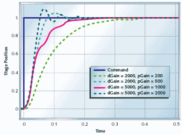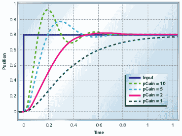 If it isn't set already, set the proportional gain to a starting value between 1 and 100. Your system will probably either show terribly slow performance or it will oscillate. If you see oscillation, drop the proportional gain by factors of eight or 10 until the oscillation stops. If you don't see oscillation, increase the proportional gain by factors of eight or 10 until you start seeing oscillation or excessive overshoot. As with the differential controller, I usually tune right up to the point of too much overshoot then reduce the gain by a factor of two or four. Once you are close, fine tune the proportional gain by factors of two until you like what you see.