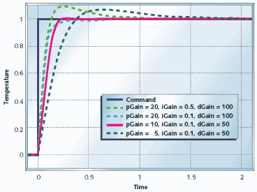 With differential control you can stabilize the precision actuator system. Figure 17 shows the response of the precision actuator system with proportional and derivative (PD) control. This system settles in less than 1/2 of a second, compared to multiple seconds for the other systems. Figure 18 shows the heating system with PID control. You can see the performance improvement to be had by using full PID control with this plant.
