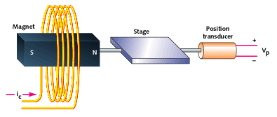 You might expect to see this sort of mechanism stabilizing an element of an optical system, or locating some other piece of equipment or sensor. Figure 4 shows such a system. Software commands the current in the coil. This current sets up a magnetic field that exerts a force on the magnet. The magnet is attached to the stage, which moves with an acceleration proportional to the coil current. Finally, the stage position is monitored by a non-contact position transducer.