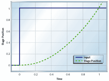 The equations of motion for this system are fairly simple. The force on the stage is proportional to the drive command alone, so the acceleration of the system is exactly proportional to the drive. The step response of this system by itself is a parabola, as shown in Figure 5. As we will see later this makes the control problem more challenging because of the sluggishness with which the stage starts moving, and its enthusiasm to keep moving once it gets going.