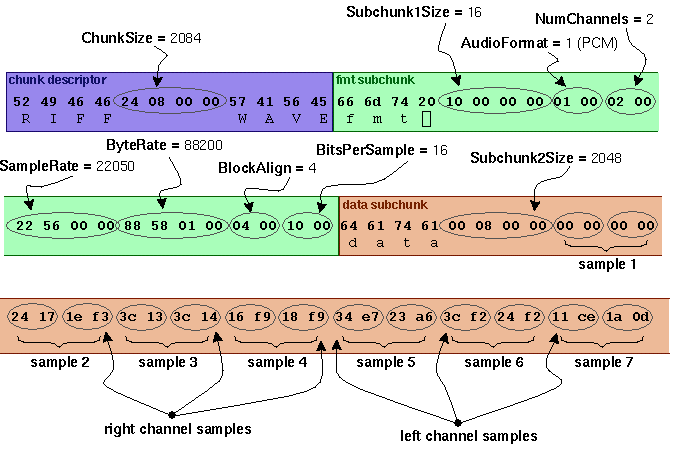 The canonical WAVE format starts with the RIFF header: 0 4 ChunkID Contains the letters "RIFF" in ASCII form (0x52494646 big-endian form). 4 4 ChunkSize 36 + SubChunk2Size, or more precisely: 4 + (8 + SubChunk1Size) + (8 + SubChunk2Size) This is the size of the rest of the chunk following this number. This is the size of the entire file in bytes minus 8 bytes for the two fields not included in this count: ChunkID and ChunkSize. 8 4 Format Contains the letters "WAVE" (0x57415645 big-endian form). The "WAVE" format consists of two subchunks: "fmt " and "data": The "fmt " subchunk describes the sound data's format: 12 4 Subchunk1ID Contains the letters "fmt " (0x666d7420 big-endian form). 16 4 Subchunk1Size 16 for PCM. This is the size of the rest of the Subchunk which follows this number. 20 2 AudioFormat PCM = 1 (i.e. Linear quantization) Values other than 1 indicate some form of compression. 22 2 NumChannels Mono = 1, Stereo = 2, etc. 24 4 SampleRate 8000, 44100, etc. 28 4 ByteRate == SampleRate * NumChannels * BitsPerSample/8 32 2 BlockAlign == NumChannels * BitsPerSample/8 The number of bytes for one sample including all channels. I wonder what happens when this number isn't an integer? 34 2 BitsPerSample 8 bits = 8, 16 bits = 16, etc. 2 ExtraParamSize if PCM, then doesn't exist X ExtraParams space for extra parameters The "data" subchunk contains the size of the data and the actual sound: 36 4 Subchunk2ID Contains the letters "data" (0x64617461 big-endian form). 40 4 Subchunk2Size == NumSamples * NumChannels * BitsPerSample/8 This is the number of bytes in the data. You can also think of this as the size of the read of the subchunk following this number. 44 * Data The actual sound data.