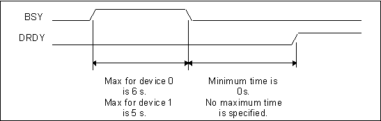 Upon receipt of a command, the device sets the BSY bit or the DRQ bit within 400 ns. Following the setting of the BSY bit equal to one, or the BSY bit equal to zero and the DRQ bit equal to one, the status presented by the device depends on the type of command: PIO data in, PIO data out, non-data transfer or DMA. See the individual command descriptions and Clause 9 for the protocol followed by each command and command type.