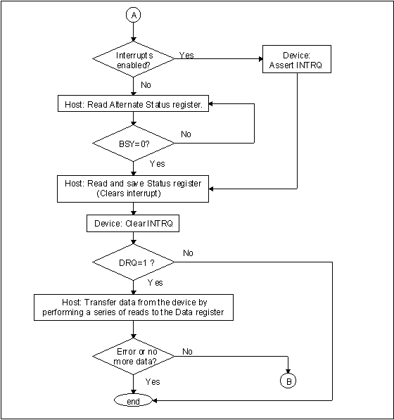 Execution of this class of command includes the transfer of one or more blocks of data from the device to the host. The following steps describe the processing of a PIO data in command. This description does not include all possible error conditions. See Figure 10.