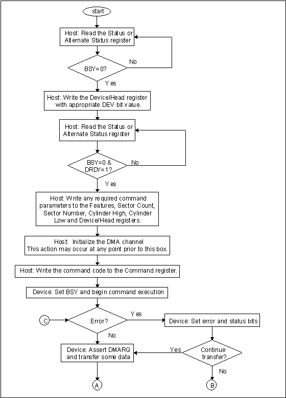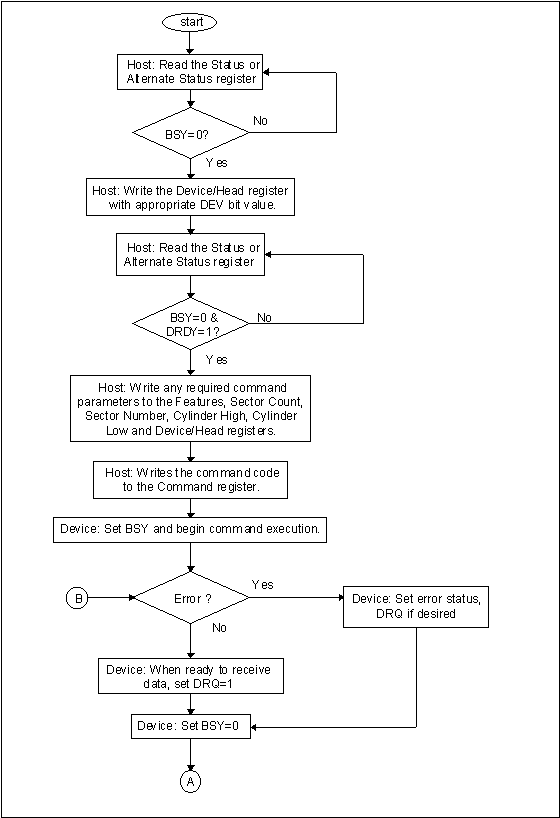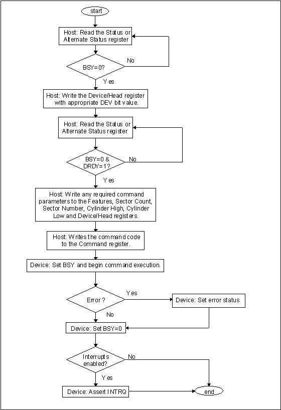 For all commands, the host first checks if the BSY bit is equal to one, and should proceed no further unless and until the BSY bit is equal to zero. For most commands, the host shall also wait for the DRDY bit to be equal to one before proceeding. The commands shown with DRDY=x can be executed when the DRDY bit is equal to zero.