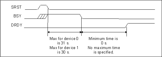 h) Device 0 clears the BSY bit when ready to accept commands that do not require the DRDY bit to be equal to 1. Device 0 shall clear the BSY bit no later than 31 s from the time that the host clears the SRST bit equal to zero;