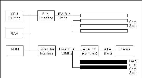 The architecture of modern PCs has changed somewhat from the original PC/ATÔ . As the processor speed increased it became necessary to separate the processor bus from the ISA bus (see figure C.2). To maintain compatibility the ISA bus continues to run at an 8 MHz rate. Processors, and their associated busses, have increased from 8 MHz to 12, 16, 25, and now 33 Mhz.