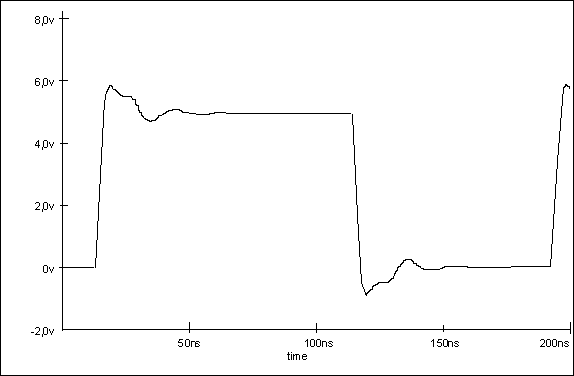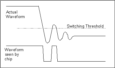 It is desirable that, even with ringing, the input signal remain less than 0,5 V after a falling edge and remain above 2,4 V after a rising edge. With CMOS drivers only the falling edge is of concern. This is due to the input switching threshold of TTL (typically 1,4 V) being closer to ground than to the supply. It turns out that designing to the 0,5 V requirement is too restrictive, so the looser requirement of 0,8 V is used here. This relaxed requirement essentially removes the noise margin inherent in TTL and depends on receiver hysteresis for proper operation. As input hysteresis has been the norm in drive design for many years now, this limitation is not considered unreasonable.
