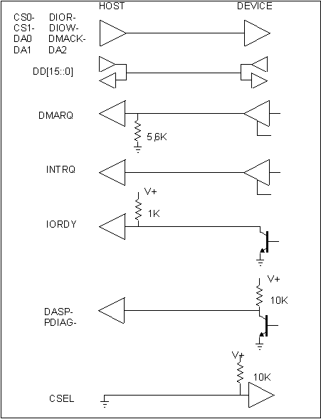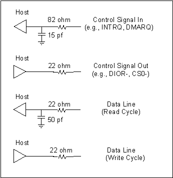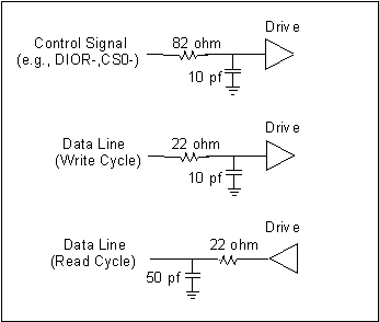 The one remaining bus structure not discussed is the open collector output driven by the device (IORDY). This signal is driven by a current source rather than a voltage source. Usually the transistor driving this signal is relatively slow and does not cause an excessive amount of ringing. The nature of IORDY makes it relatively insensitive to ringing that might occur.