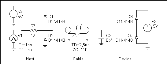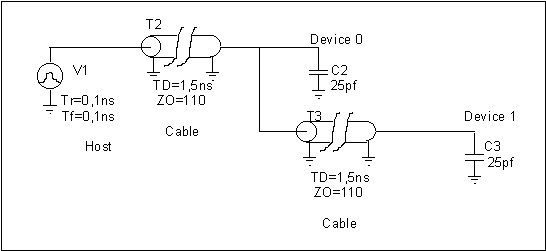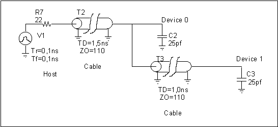 The most significant timing issue is the propagation delay of the cable. This needs to be added to the host-side timing. The SPICE model in figure C.17 shows an unterminated host with very fast rise times driving a cable with worst case loads. Two unterminated devices are assumed with the maximum allowed capacitive loading of 25 pF.