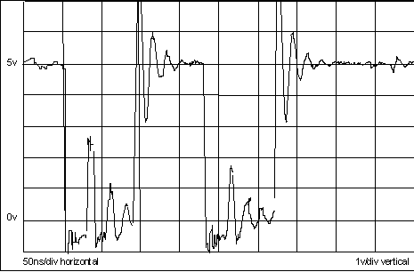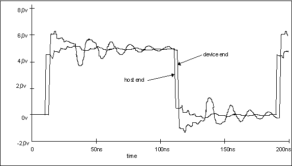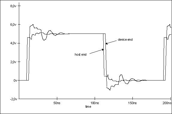 The simulation results in figure C.6 show the waveforms at both the host and device ends of the cable. The signal at the device end has ringing of sufficient amplitude to cause false triggering of the device. This is confirmed by transmission line theory which indicates that ringing will occur whenever the source impedance is lower than the characteristic impedance of the cable, and the termination is of higher impedance than the cable. The greater the mismatch, the greater the amplitude of the ringing. The oscilloscope trace shown in figure C.7 confirms the results of the simulations.