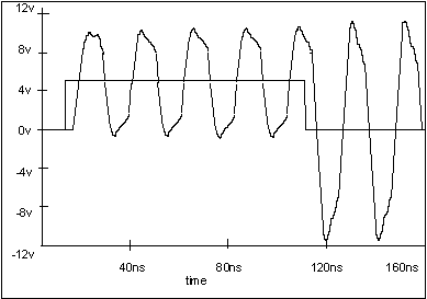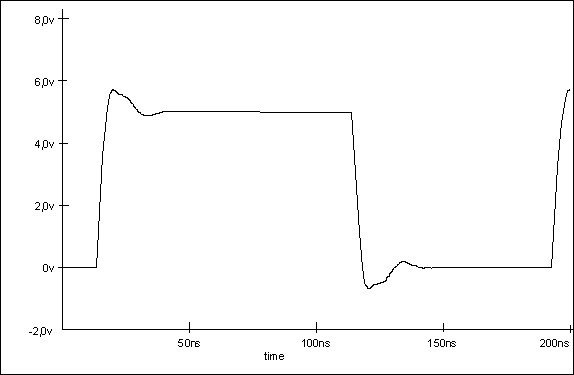 Is a 22 ohm resistor adequate for reducing the ringing? The simulation was repeated using the same model as shown in figure C.5 with a 22 ohm series resistor added. The results of that simulation appear in figure C.8. The ringing is significantly reduced from the previous simulation in figure C.6.