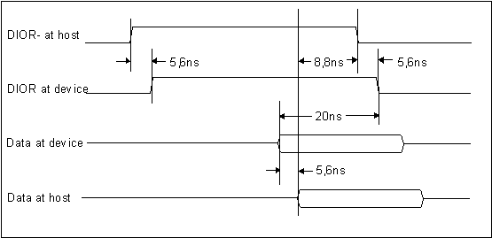 From the host point of view, all of the ATA timings are corrected by adding the propagation delay of the cable to insure that the timing is correct at the input pins of the furthest device. Figure C.19 shows a typical corrected result using the read cycle data setup time as an example. The ATA document specifies a setup time at the device of 20 ns (PIO Mode 3). The remaining setup time at the host is only 8,8 ns (20 - 2 x 5,6).
