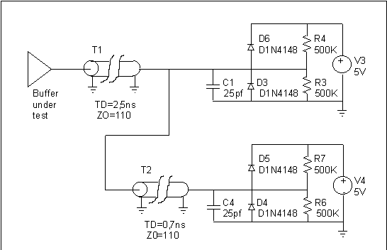 Using SPICE models similar to the one shown in figure C.14 the eight delay parameters required are derived. A second device appears in the model as a lumped capacitance of 25 pF which causes the maximum delay. The resulting values appear in table C.3. By examining the values in the table it should be clear why the cable propagation delay is often referred to as being about 5 ns.