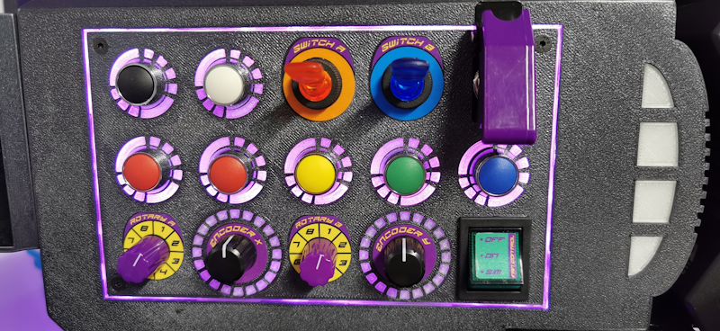 The “box” features 13 momentary buttons, three toggle switches, two eight-way rotary switches (effectively 16 more inputs), X and Y axis inputs via two further rotary encoders, and Z axis via analog Hall effect sensor.